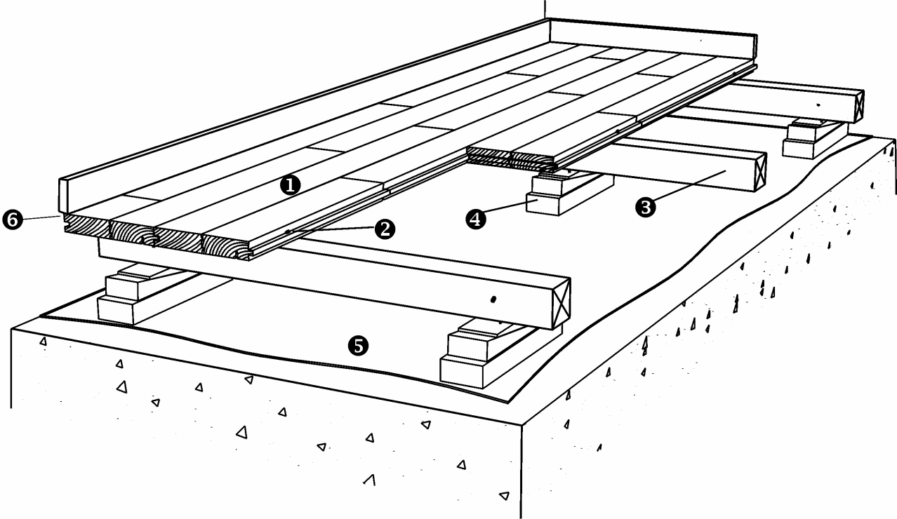 Les lames massives Junckers, clouées à des lambourdes ou des solives, constituent des parquets porteurs. Le système de lambourdage utilise des lambourdes de 36 x 50 mm minimum, installées et mises à niveau sur une sous-construction dure. Les solives sont des pièces de bois à angle droit de 100 x 100 mm, et sont utilisées sur des espaces de ventilation et des caves, ou comme plancher structurel.