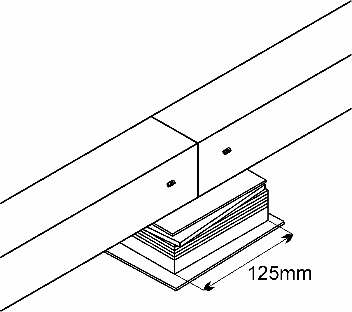 Les joints entre lambourdes peuvent reposer sur une seule cale à condition que cette cale mesure au moins 125 mm de long dans le sens de la lambourde, voir Fig 4. Ces joints doivent être décalés les uns par rapport aux autres de 600 mm au minimum. Ils ne peuvent être alignés que si les extrémités des lambourdes sont solidement fixées par des plaques. Au niveau des murs, etc. Le calage ne doit pas être placé à plus de 100 mm de l'extrémité des lambourdes.