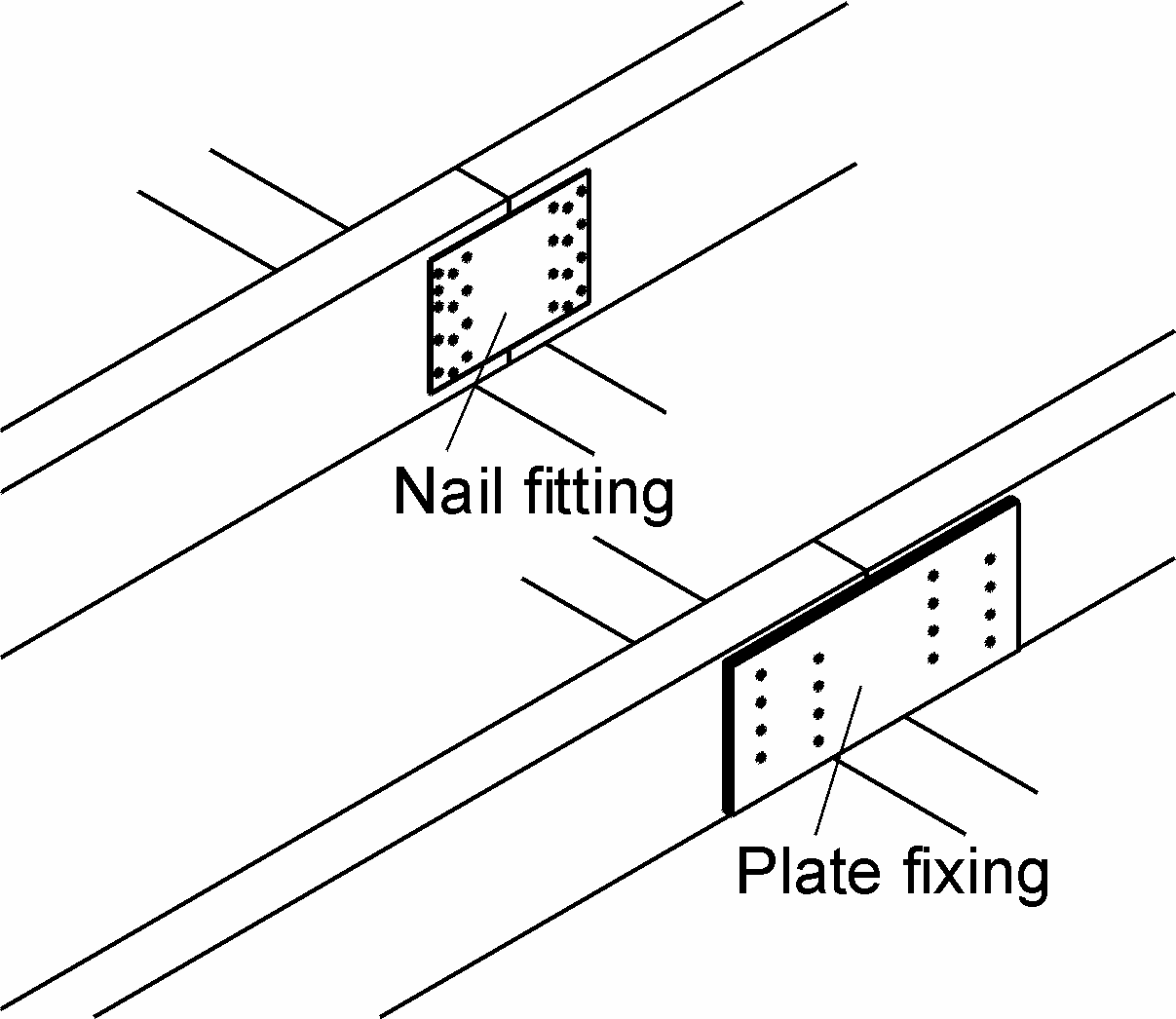 Les joints entre solives doivent toujours être situés au-dessus d'une structure de support et les extrémités des deux solives doivent être fixées mécaniquement, par des plaques ou des clous, voir Fig 5.