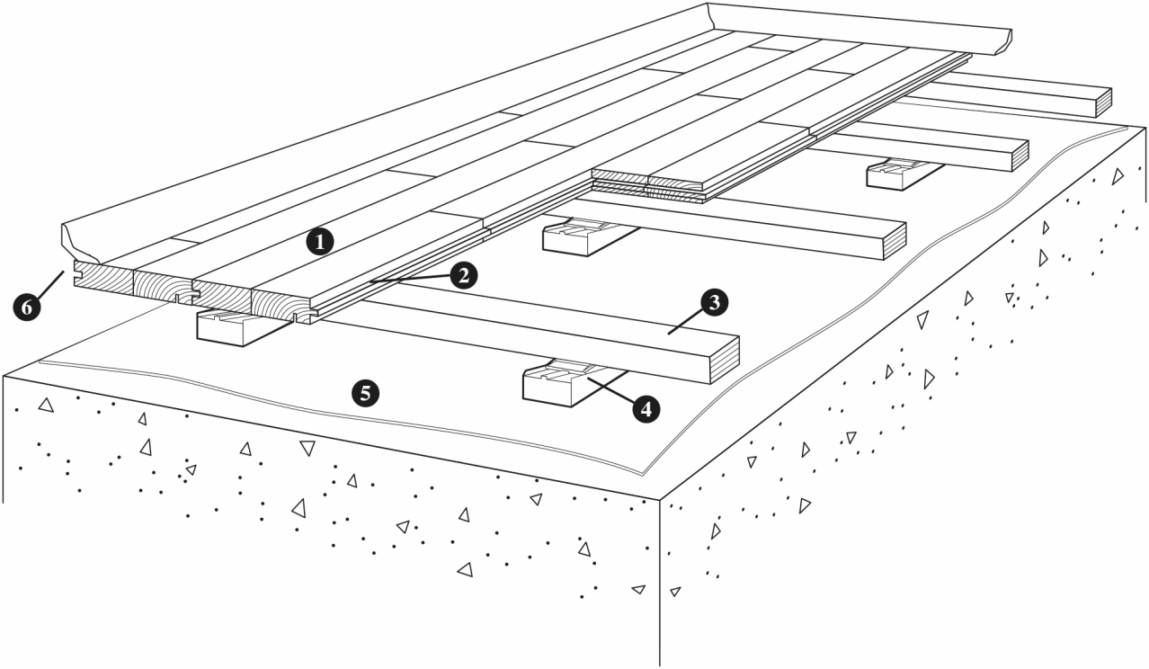 • Lambourdes de 25,5 x 60 x 3600 mm avec patin résilient de 12 mm pré monté dans une rainure à l'envers de la lambourde.