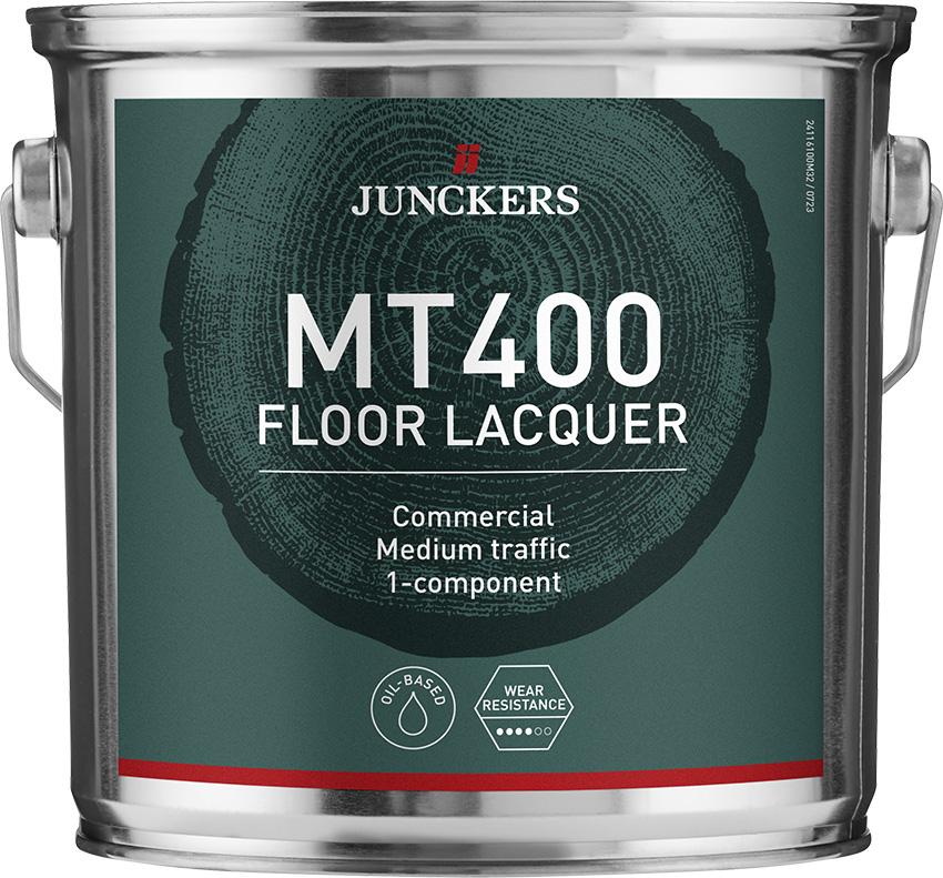 Parquets traités : Nettoyer avec Junckers Neutralizer + 1 couche de MT400 Floor Lacquer 10 m²/litre.