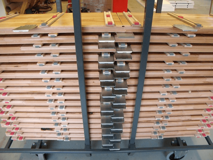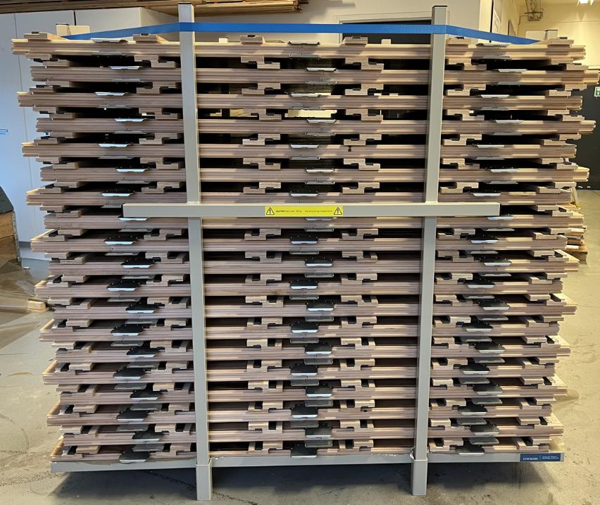 Les chariots de stockage conçus sur mesure par Junckers facilitent le transport et le stockage des panneaux.