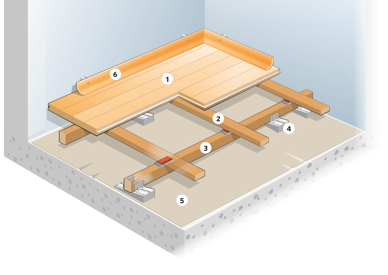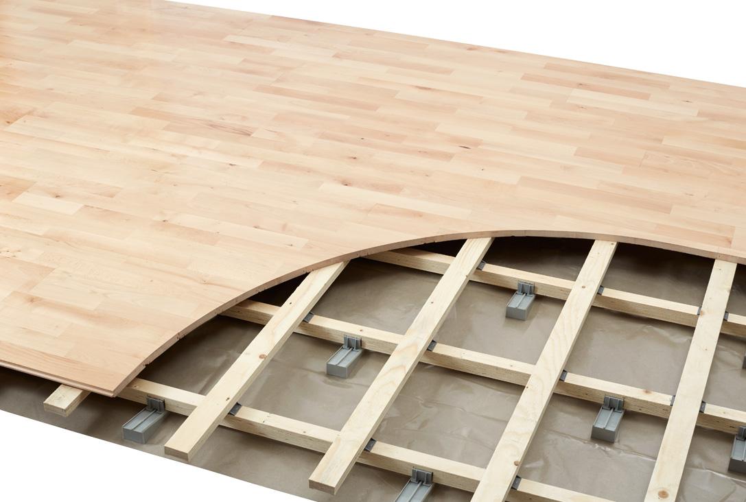 Le système de sol sportif en parquet massif DuoBAT 120+ est constitué de lames de 22 mm clouées à une sous-structure résiliente constituée de deux rangées de lambourdes pré-fabriquées et posées croisées. Des patins résilients « J-Locks » sont montés entre les lambourdes à leur point de croisement, ce qui assure une connexion rapide et sure entre les lambourdes inférieures et supérieures.