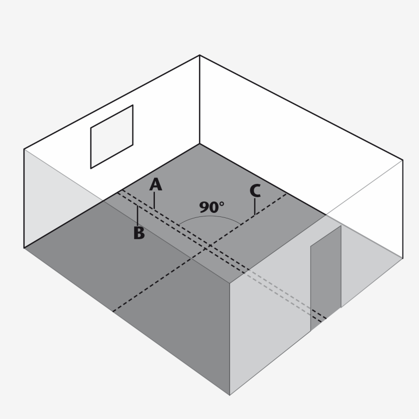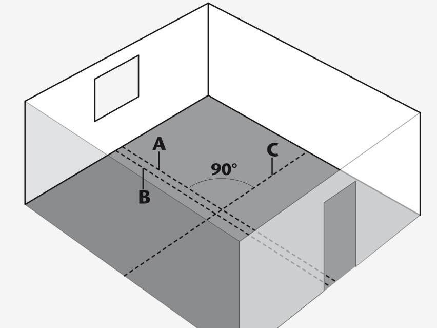 Tracez deux lignes cenrtrales dans la piéce (lignes A et C) à l'aide d'un cordeau traceur ou d'une ficelle, formant un angle de 90° l'une par rapport à l'autre.