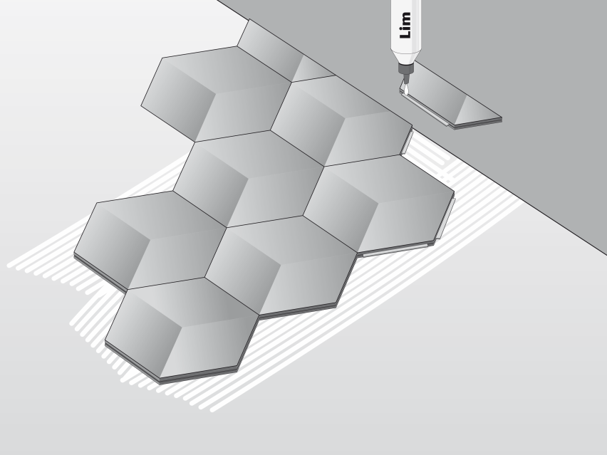 Les dalles en bois Hexparket ne doivent PAS être collées dans la languette et la rainure. Cependant, les dalles en bois qui ne peuvent pas être fixées de manière sécurisée peuvent occasionnellement etre collées aux joints de tête contre les murs, ainsi que dans la languette et la rainure de la dernière rangée de dalles contre le mur.