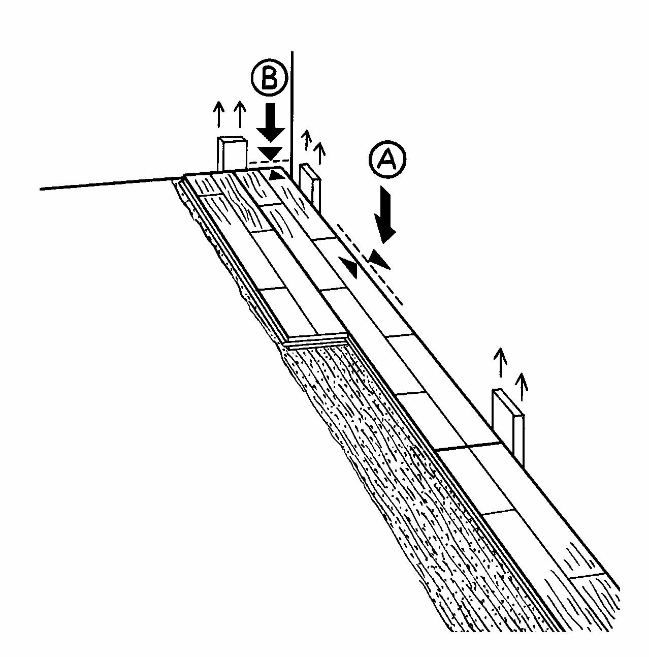 Coupez la dernière rangée de lames de plancher afin de former un espace de dilatation de taille correcte au niveau du mur (A). Utilisez un extracteur de joints (B) pour insérer la dernière lame de plancher en place. Retirez les entretoises ou les cales temporaires avant d'installer les plinthes.