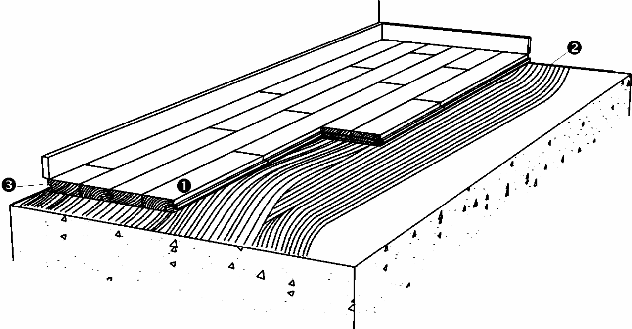 Les parquets collés sont constitués de lames massives ou lames larges, voir Fig 2, posées à l'aide de colle sur une sous-construction plane et portante en béton, béton cellulaire, ragréage ou bois.