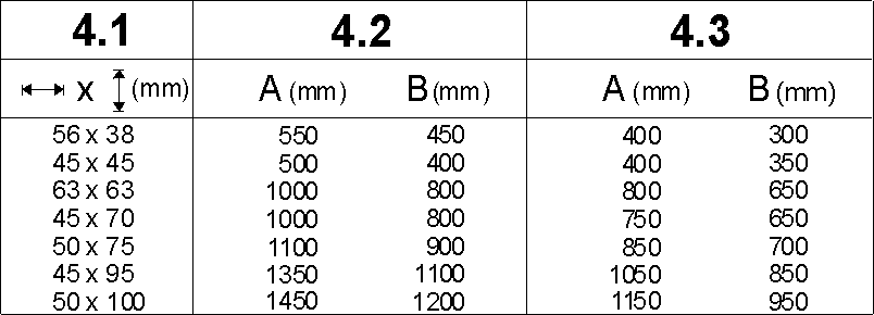 Les lambourdes doivent être sèches, droites sans déformation ou torsion. Les lambourdes doivent être correctement espacées. Les entraxes B et C sont déterminés en fonction de l'utilisation du parquet, les charges prévues et le type de parquet (lames 20,5 mm ou lames 2 frises 22 mm) :