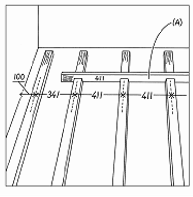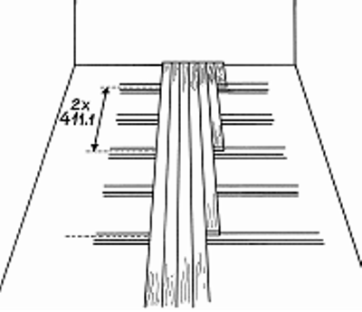 Si l'entraxe des lambourdes est de 411,1 mm, la distance entre les têtes de lames de 2 rangées consécutives doit être de 2 x 411,1 mm, soit 822,2 mm (vois dessin ci-contre).