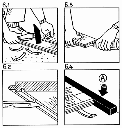 Retourner la lame et enfoncer la partie percée du clip dans la rainure de manière à ce que l'extrémité non-percée du clip soit pointée vers la languette, dans le sens de la pose, voir Fig 6.1 et 6.2.