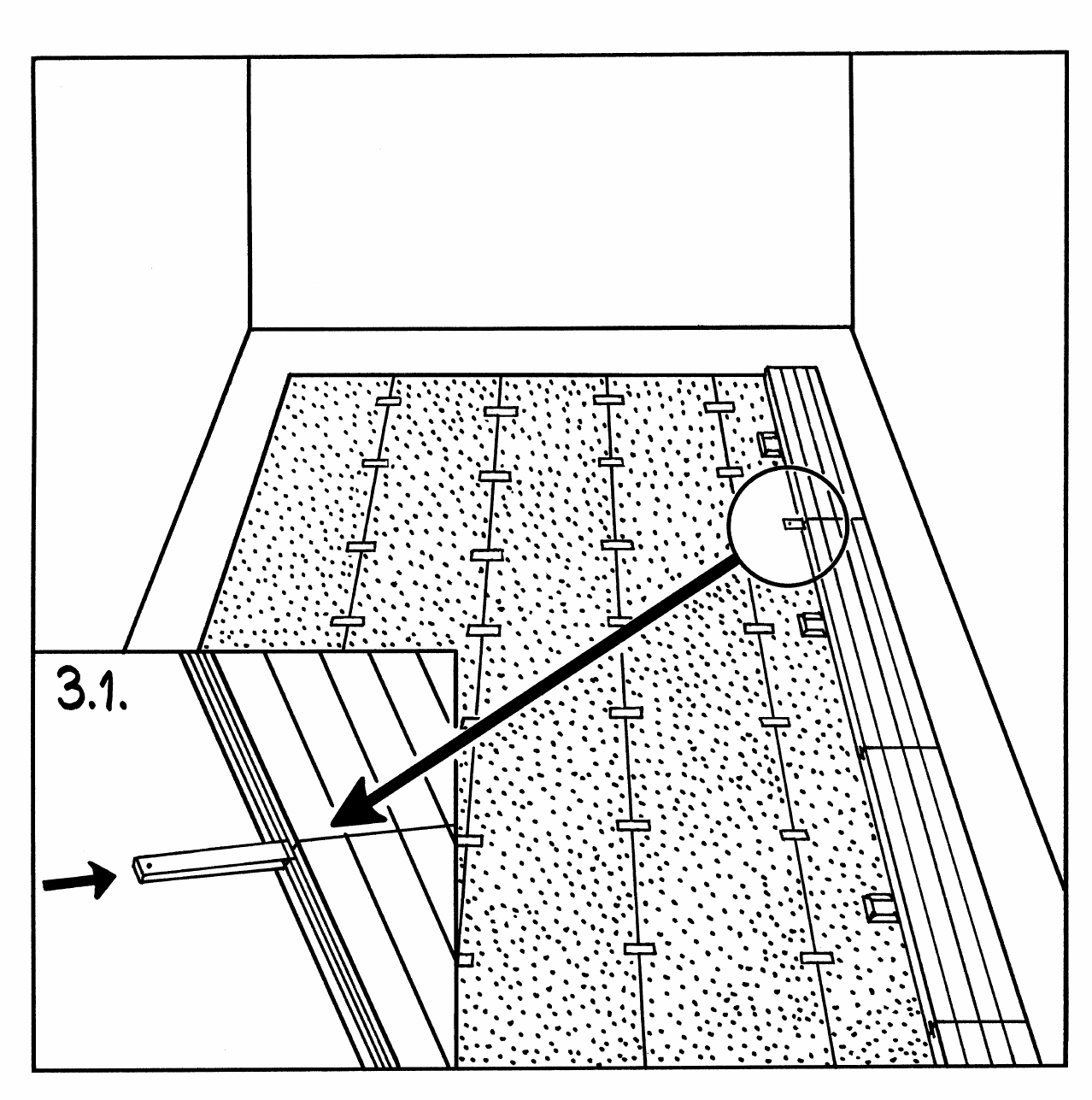 Poser la première rangée de panneaux en les alignant, clavettes de fixation orientées dans le sens de la pose. Assembler les extrémités des panneaux avec des fausses languettes d'assemblage, voir Fig 3.1.
