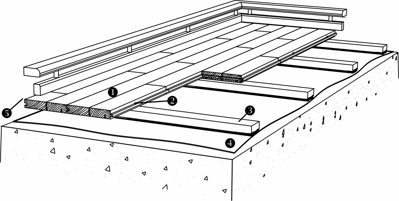 Une barrière contre l'humidité est établie en posant une membrane étanche à l'humidité, une membrane PE de 0,20 mm ou un polythène de 1000 g, par exemple Junckers Moisture Barrier, directement sur le béton avant de poser les lambourdes, voir Fig. 4 (ligne pointillée).