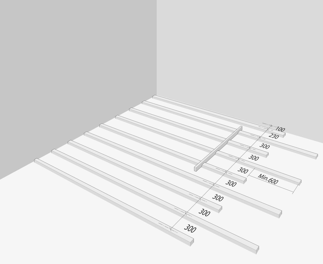 Toutes les autres rangées de lambourdes doivent être posées avec un entraxe de 300 mm en utilisant les lambourdes d’espacement. Les extrémités des lambourdes ne doivent pas être alignées mais disposées en quinconce avec un espacement minimum de 600 mm de la rangée adjacente (Fig.4).
