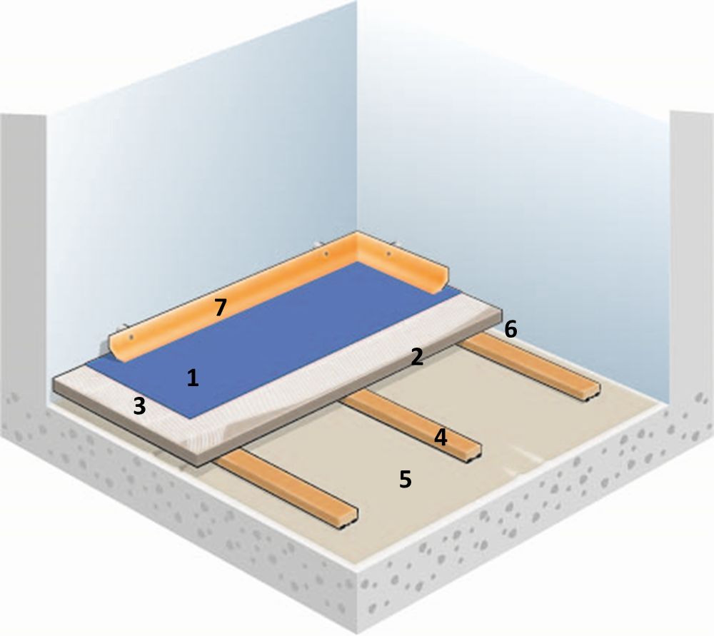 La solution est constituée de panneaux de particules de 22 mm fixés à un système de sous-plancher composé de lambourdes lamellées collées munies de 2 bandes de mousse spécialement conçues pour absorber les chocs.